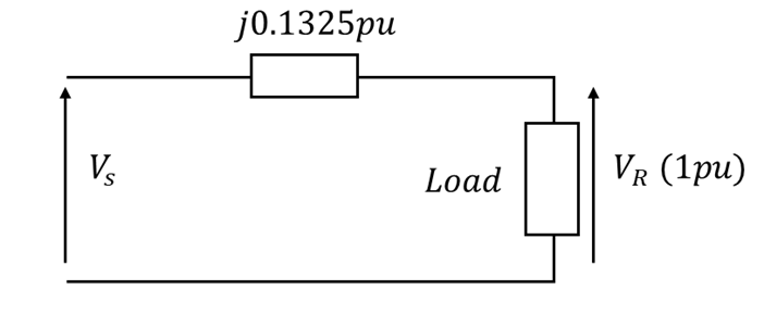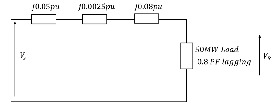 The specified load values introduce a challenge. The problem defines the load in terms of real power P (in watts) rather than apparent power S (in volt-amperes), which is typically required for system calculations. Furthermore, the line current  is not provided, preventing calculation of the voltage, Vs.