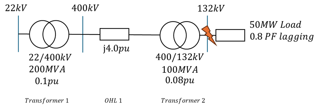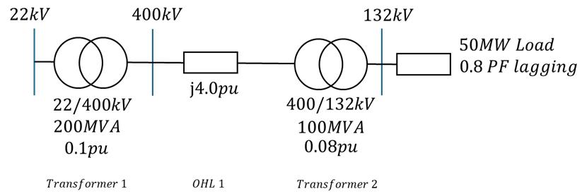 • Transformer 1 (22/400 kV): Rated at 200MVA with an impedance of 0.1pu on its own base. To convert this to the 100MVA base: