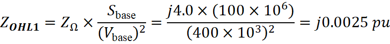 • Overhead Line (OHL1): For the overhead line, the impedance is given in ohms. Convert it to per-unit using: